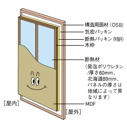 | 住宅の断熱、気密性能は構造体と開口部の総合点で決まります。SW工法ではこれまでの最大の問題点だった開口部(窓や玄関)の断熱化にも 十分な配慮を施しています。 |